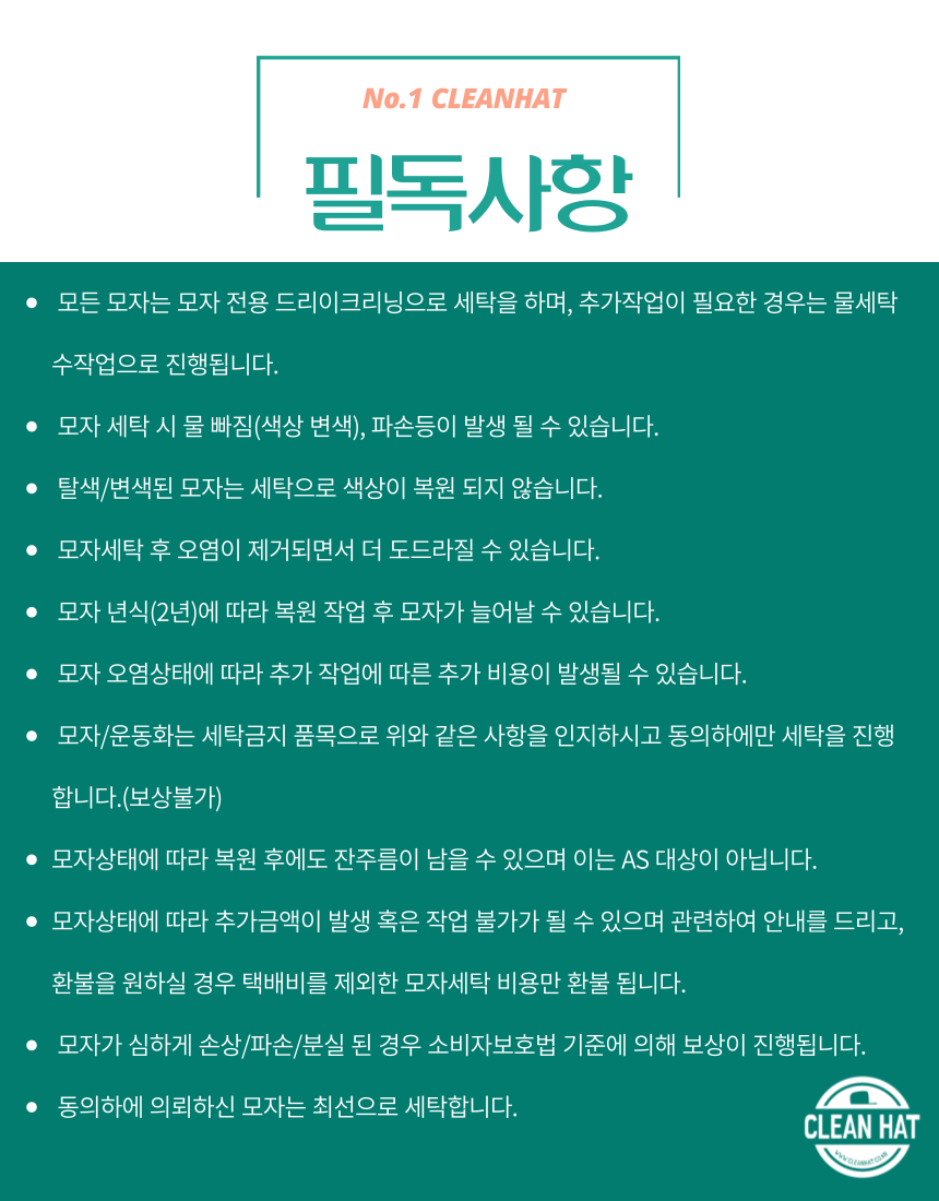 ※ 클린햇이 고급모자로 분류된 브랜드모자와, 판매가 80,000원 이상 모자는 고급모자로 분류되오며, 일반모자로 결제 시 차액 금액이 발생됩니다.